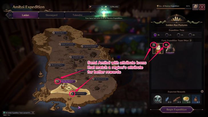 Как только вы определитесь со всеми параметрами Экспедиции, нажмите Начать Экспедицию - Begin Expedition, чтобы отправить своих Amitoi. Помните, что Amitoi, находящиеся в Экспедиции, не могут присоединиться к вам во время исследования открытого мира, поэтому выбирайте мудро!