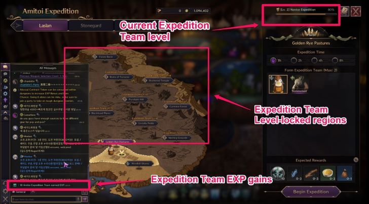 Помимо материалов в наградах Expected Rewards, вы также получаете опыт Expedition Team EXP каждый раз, когда полностью завершаете Экспедицию. Вы будете уведомлены о том, сколько опыта вы заработали, в Чате, а уровень вашей Команды Экспедиций можно проверить в верхнем правом углу меню Экспедиций Amitoi .